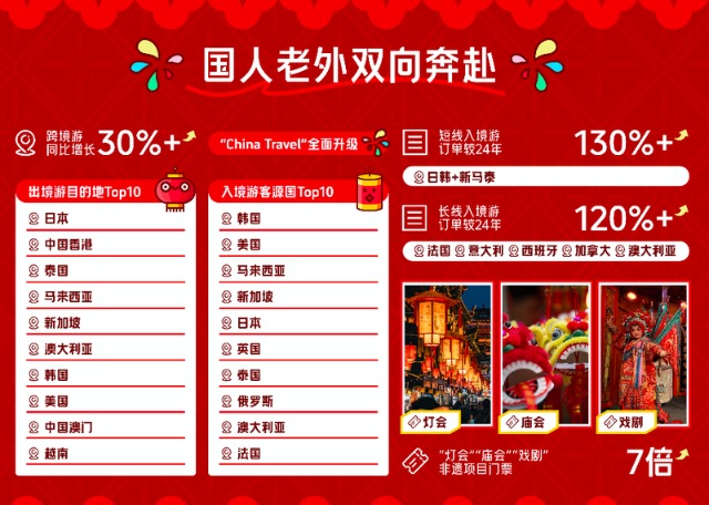 今年春节假期延续了“China Travel”的热潮。携程指出,今年初国际流量的注入与“非遗版春节”在社媒上的广泛传播令China Travel升级Chinese New Year。春节假期期间,平台上的入境游门票订单同比去年增长180%,入境游酒店订单同比增长超6成。